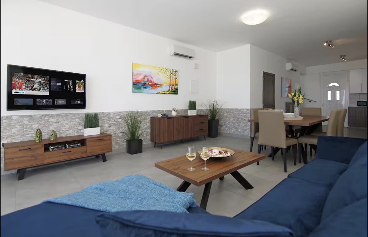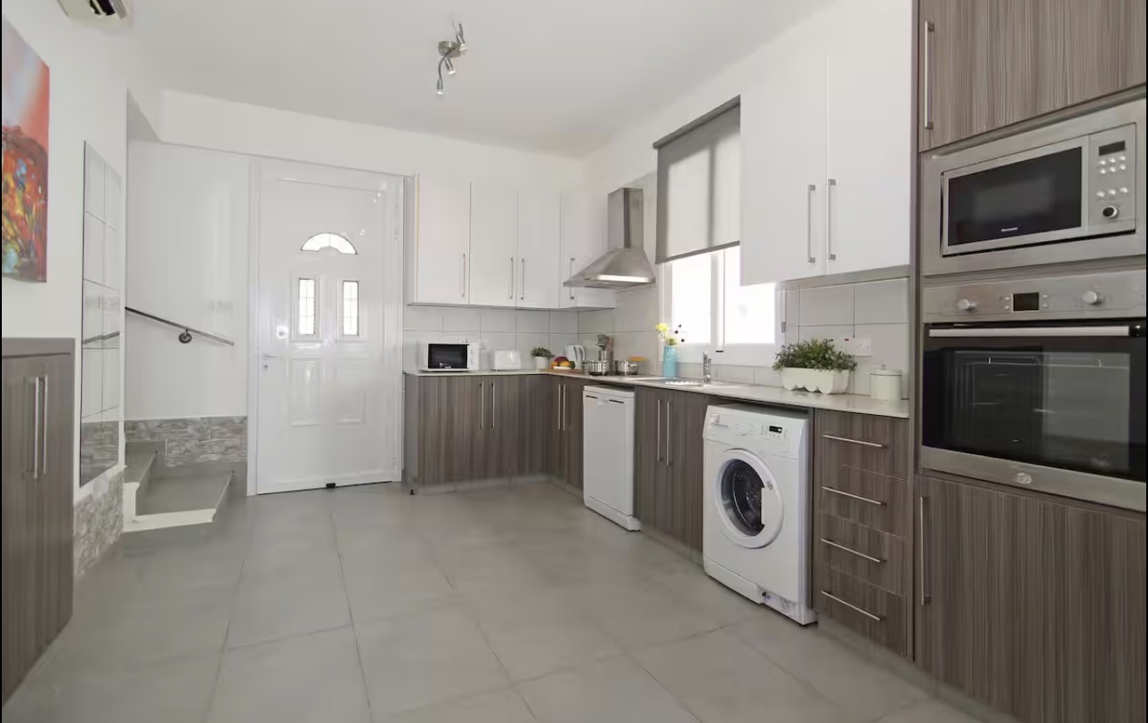 Уютный интерьер включает гостиную открытой планировки с кухней, три спальни и несколько ванных комнат, что обеспечивает комфортное размещение для семьи или компании.
