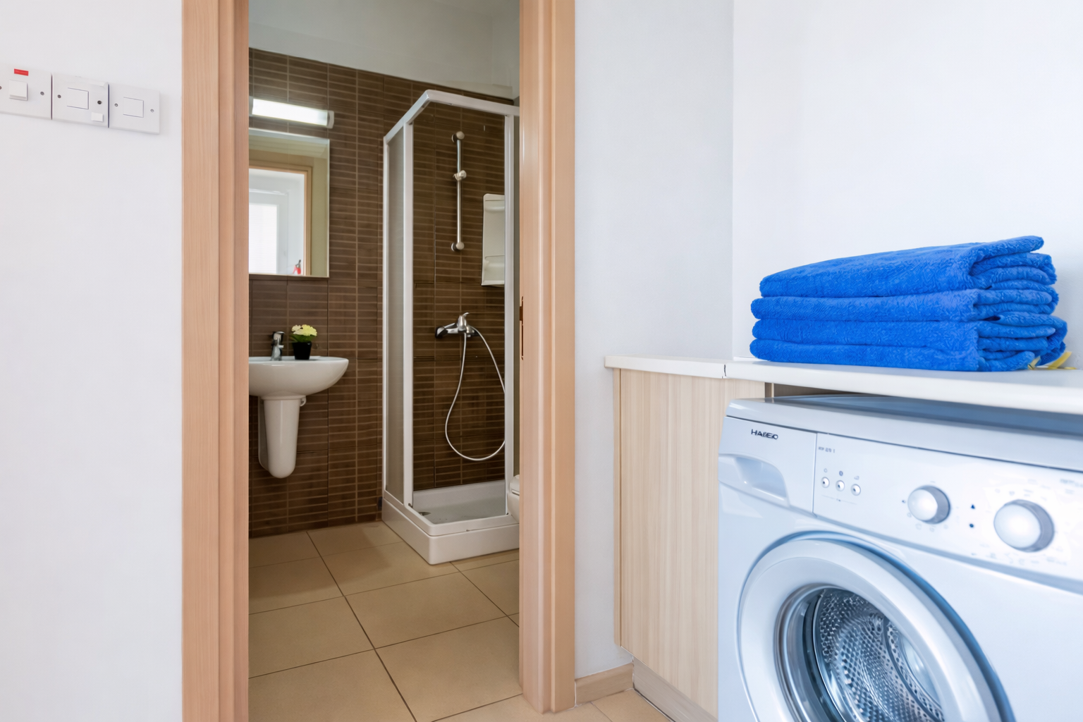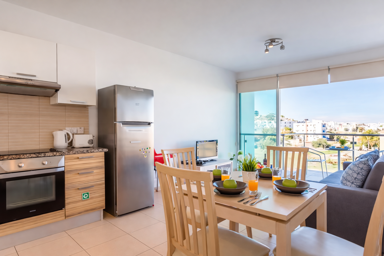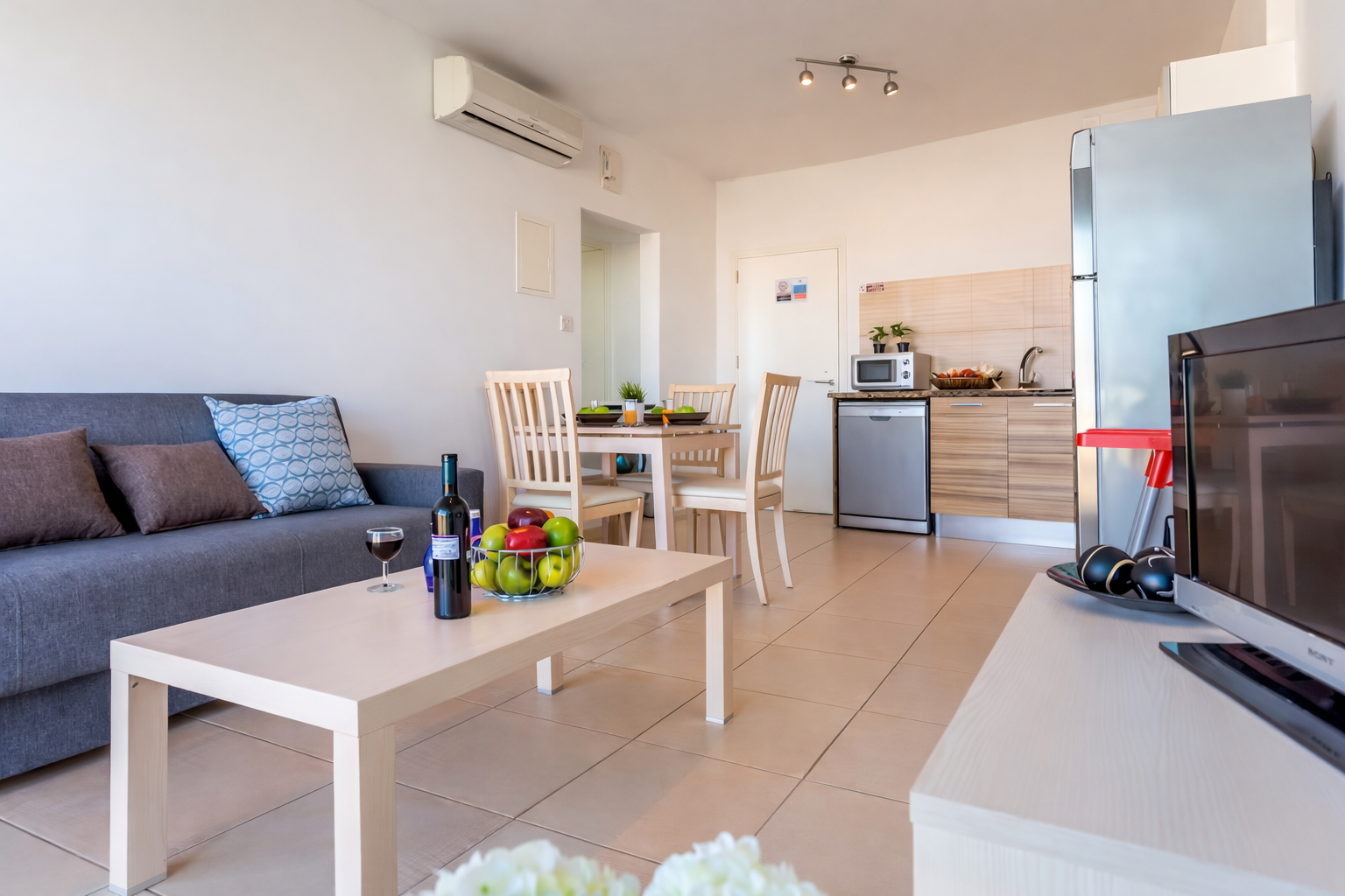 Кухня полностью оборудована для комфортного проживания: плита, духовка, микроволновая печь, холодильник и посудомоечная машина — всё, что нужно для приготовления любимых блюд. В гостиной вас ждёт удобный диван и телевизор с кабельными каналами — идеальное место для отдыха после насыщенного дня. Также доступны стиральная машина и бесплатный Wi-Fi.