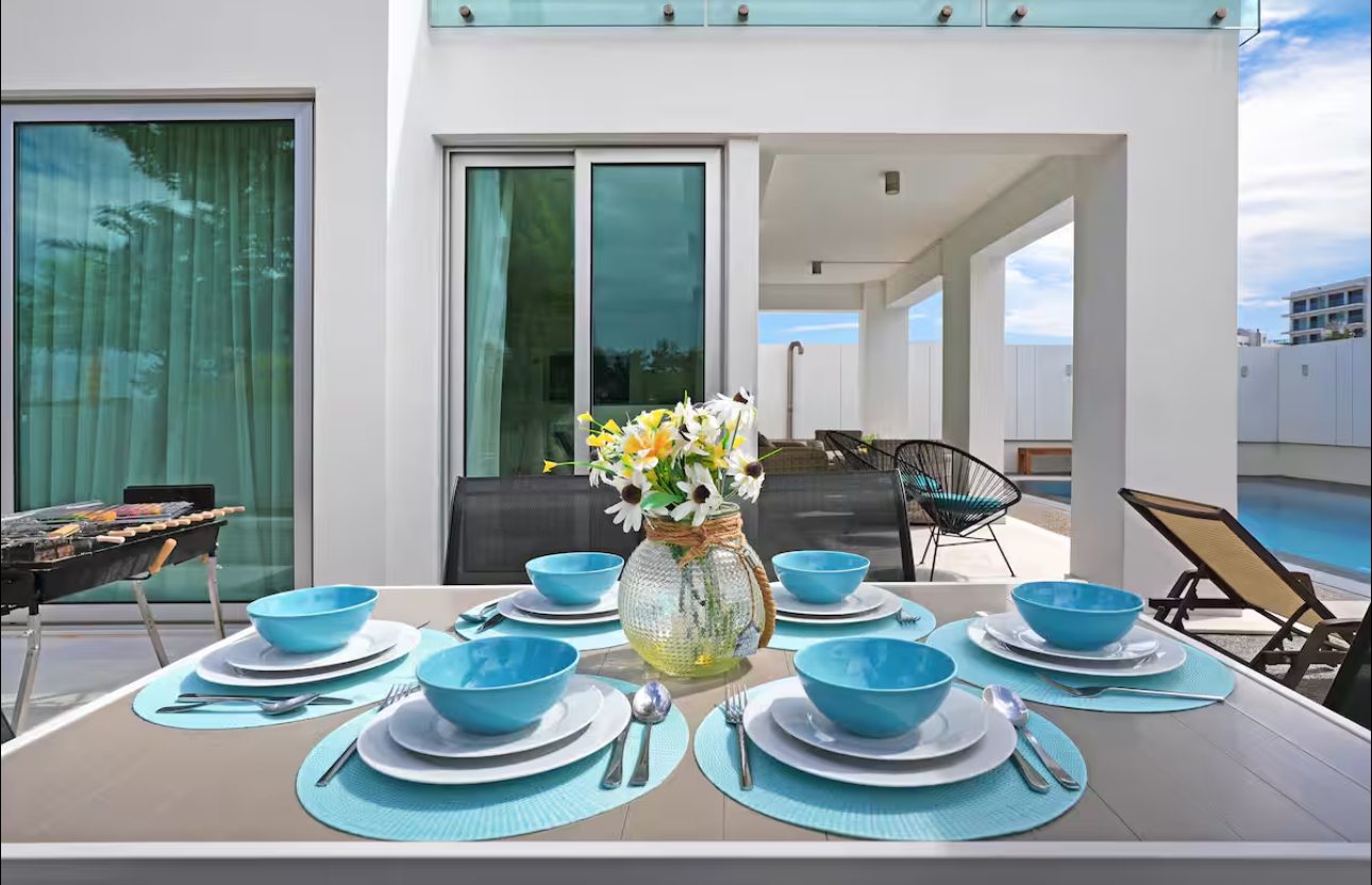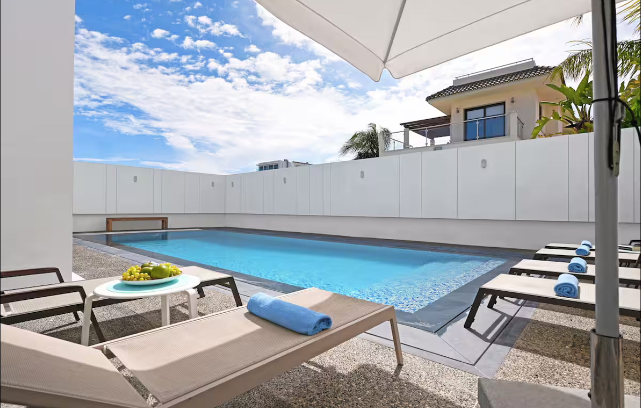В распоряжении гостей — частная парковка и собственный бассейн, создающие атмосферу уединения и полного расслабления. Современный экстерьер и светлый, аккуратный интерьер формируют ощущение уюта и комфортной современной жизни. Ухоженный зелёный сад и просторный балкон на втором этаже с красивым видом подчёркивают близость к природе.