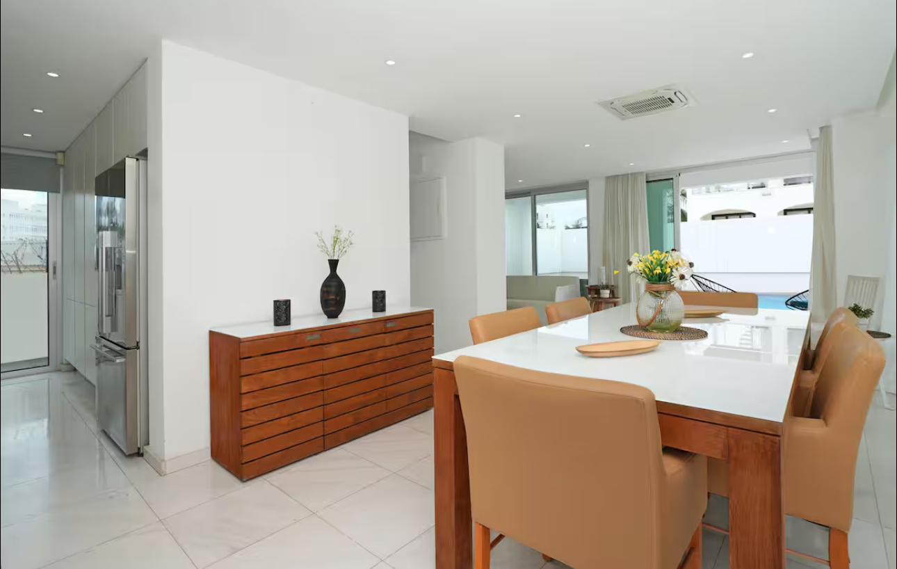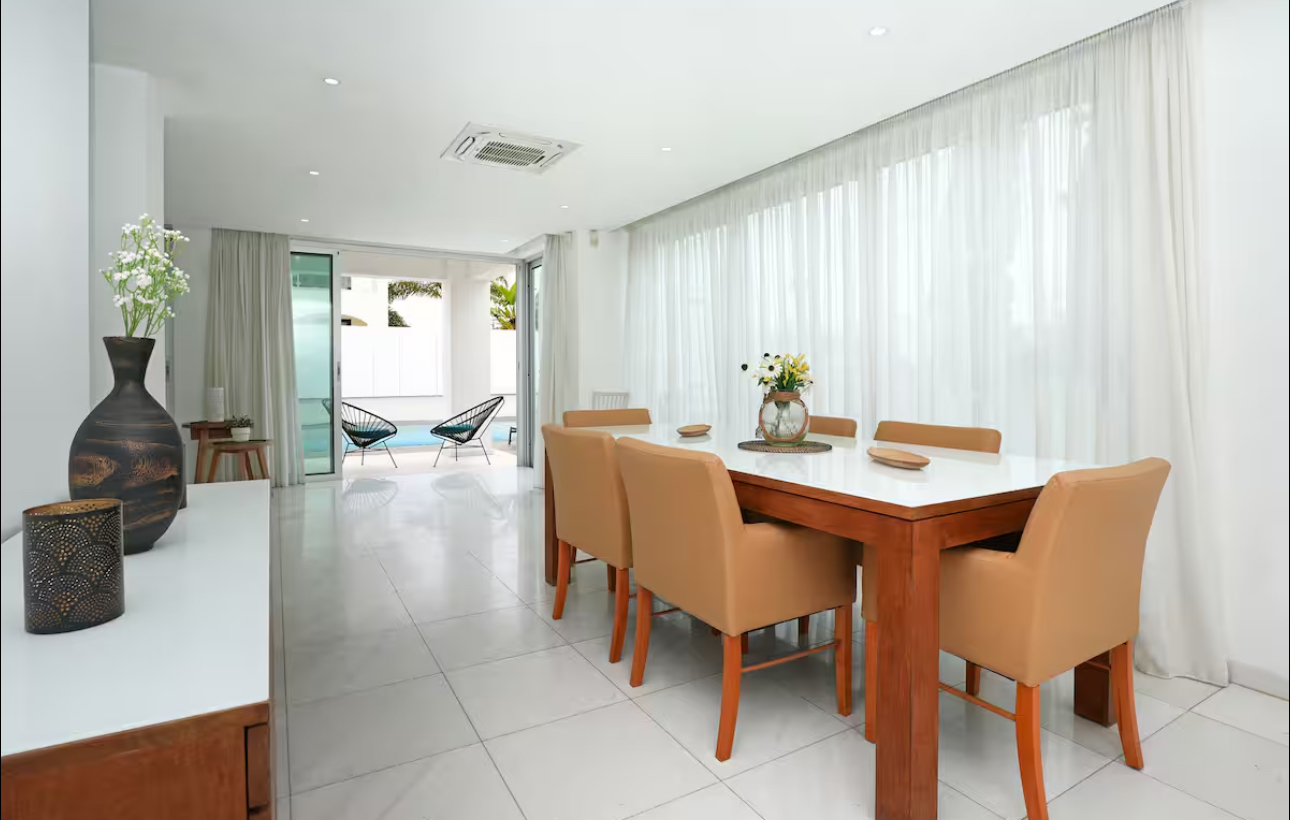 На первом этаже расположена просторная гостиная открытого типа, объединённая с кухней и обеденной зоной. Раздвижные двери ведут на веранду и к частному бассейну — идеальное место для отдыха, завтраков на свежем воздухе или вечерних посиделок.