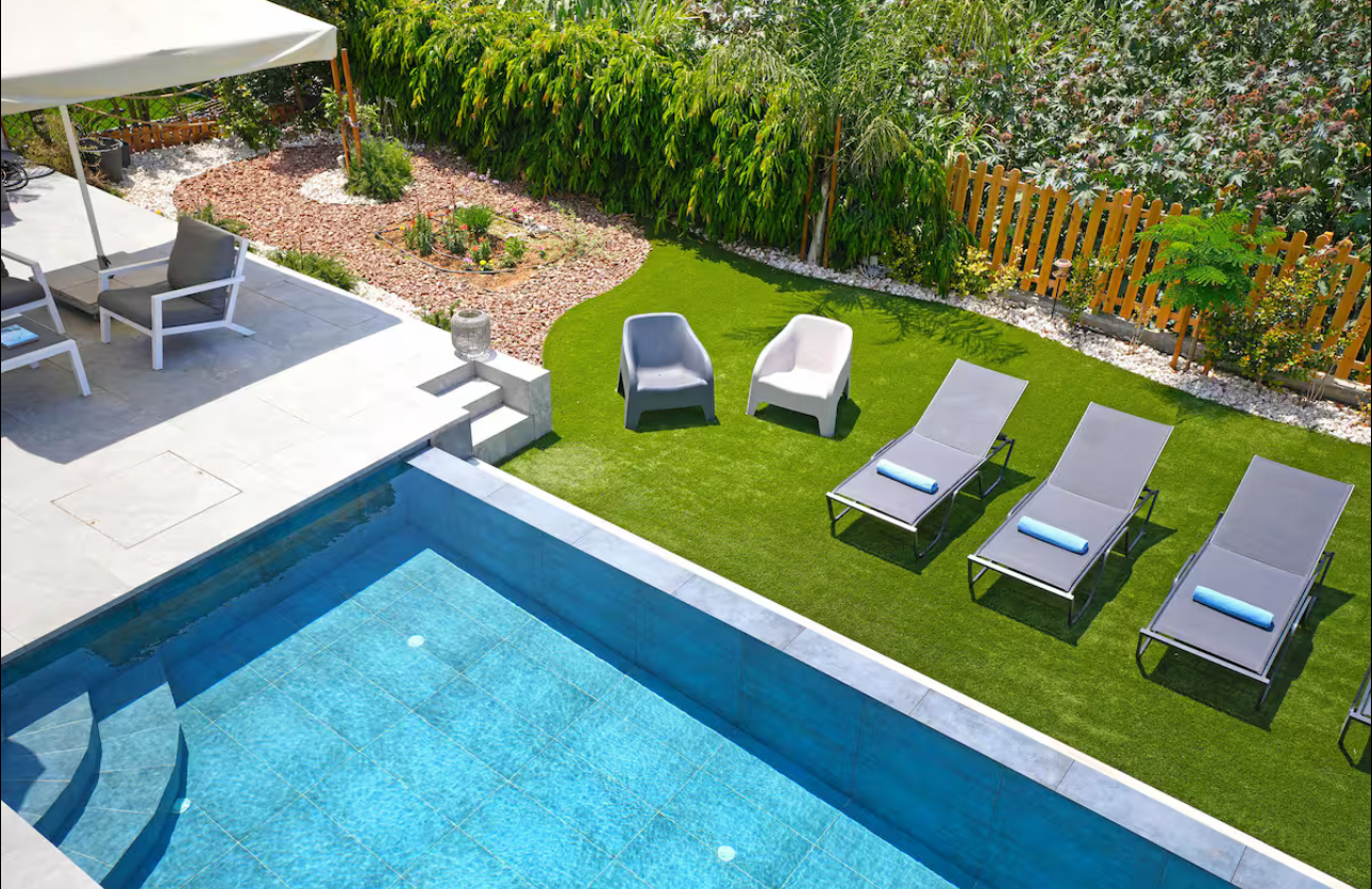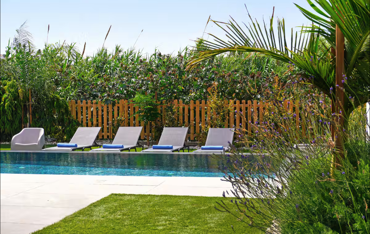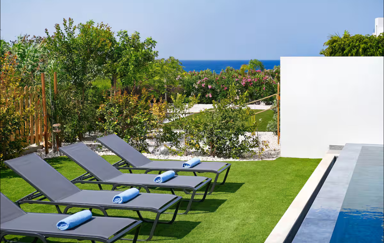 Вокруг — ухоженный частный сад, шезлонги, тень от зонтов, а также открытый душ, удобный для быстрого освежения после пляжа.