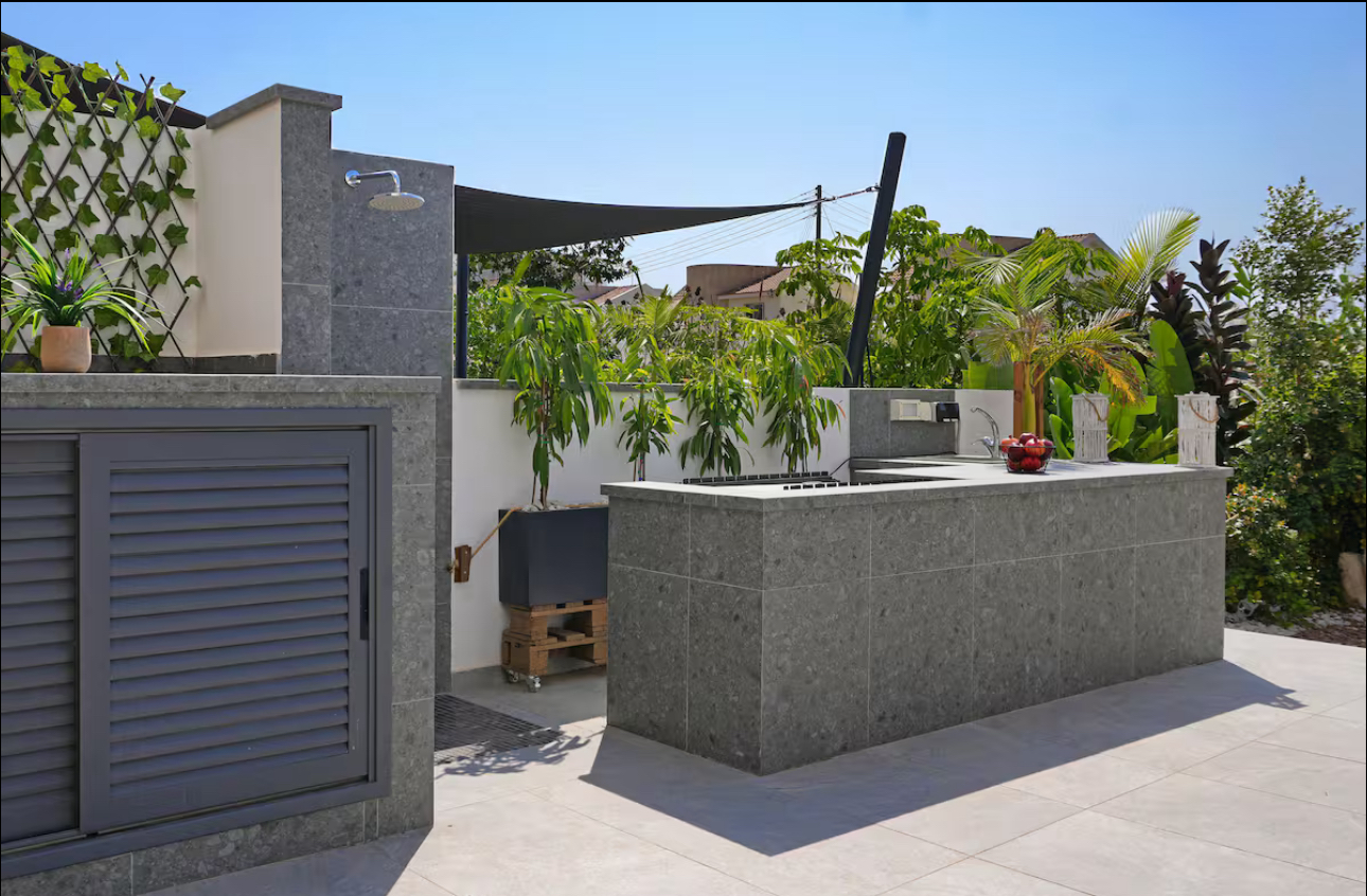 На территории есть встроенная BBQ-зона, а также переносной угольный гриль — отличное решение для ужинов на свежем воздухе.