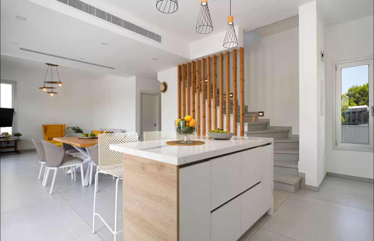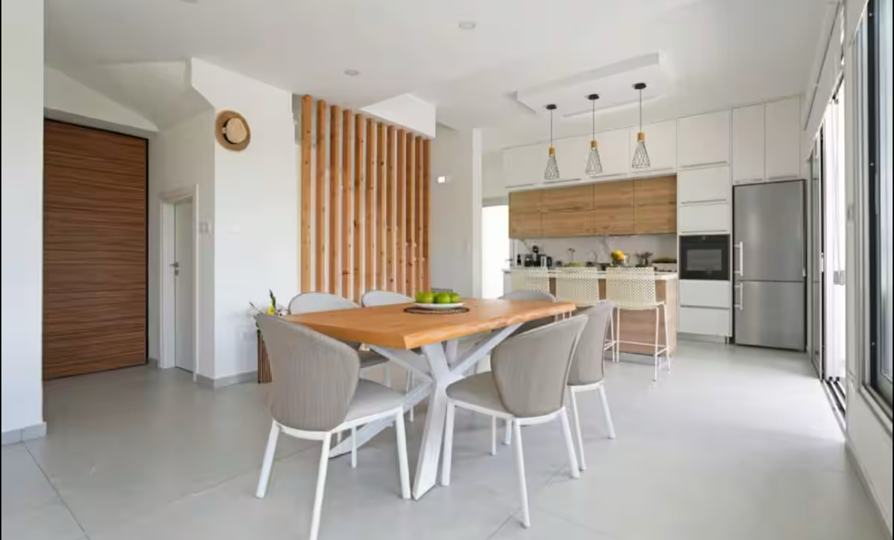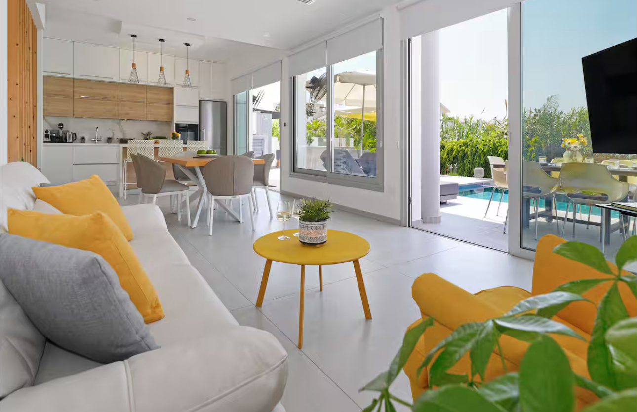 • Светлая гостиная открытого плана, объединяющая уютную зону отдыха, столовую и полностью оборудованную кухню. Панорамные окна дарят ощущение простора и прямой выход к бассейну.