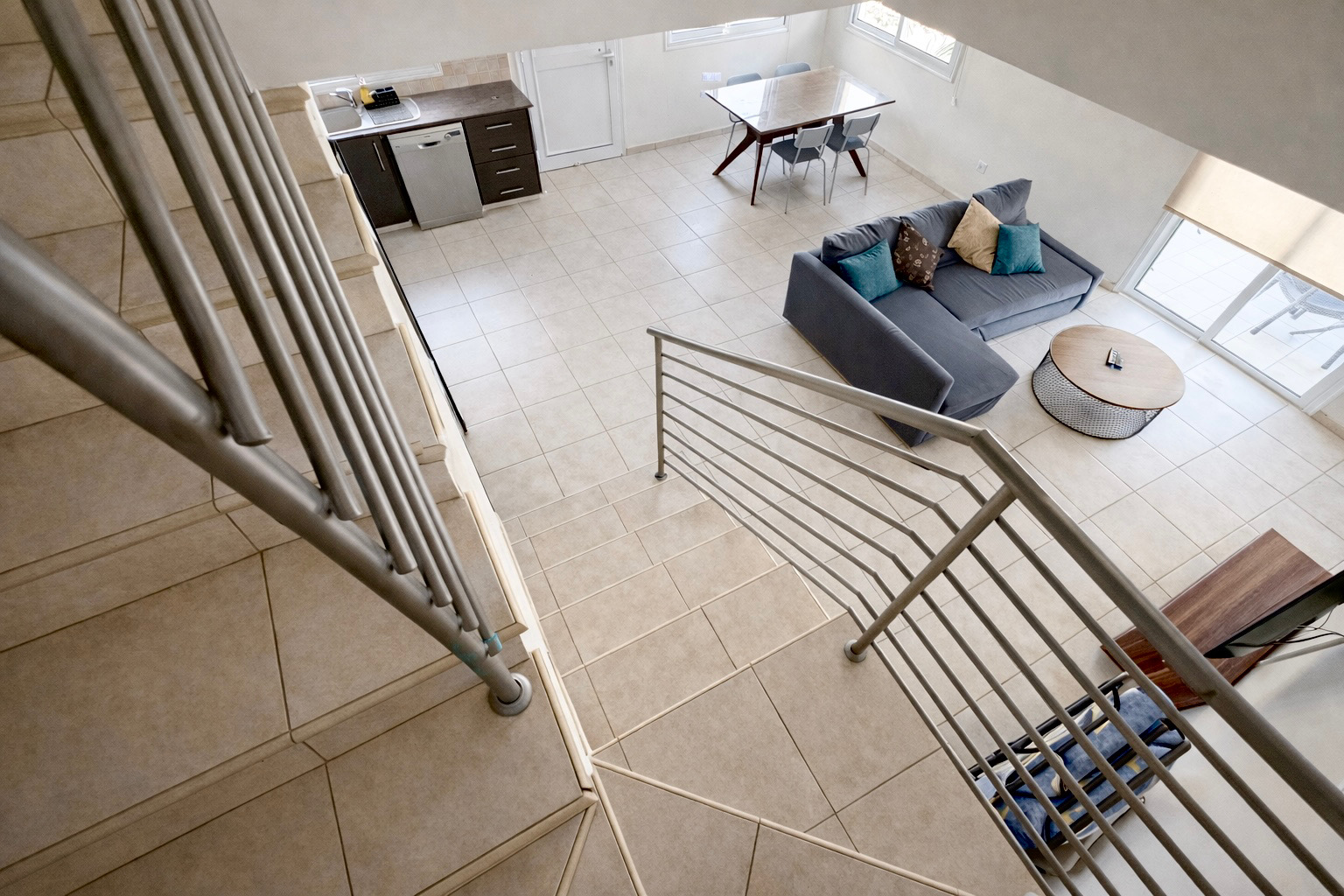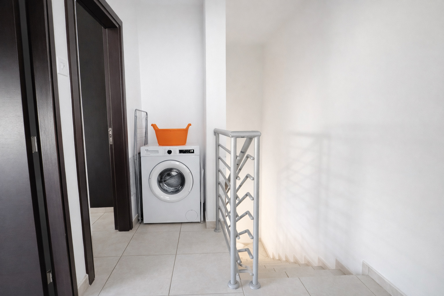На второй этаж ведет лестница. Семейная спальня имеет двух спальную кровать, вторая спальня две односпальные. Между ними совмещенный санузел с ванной и стиральная машина. На первом этаже доступен гостевой туалет.