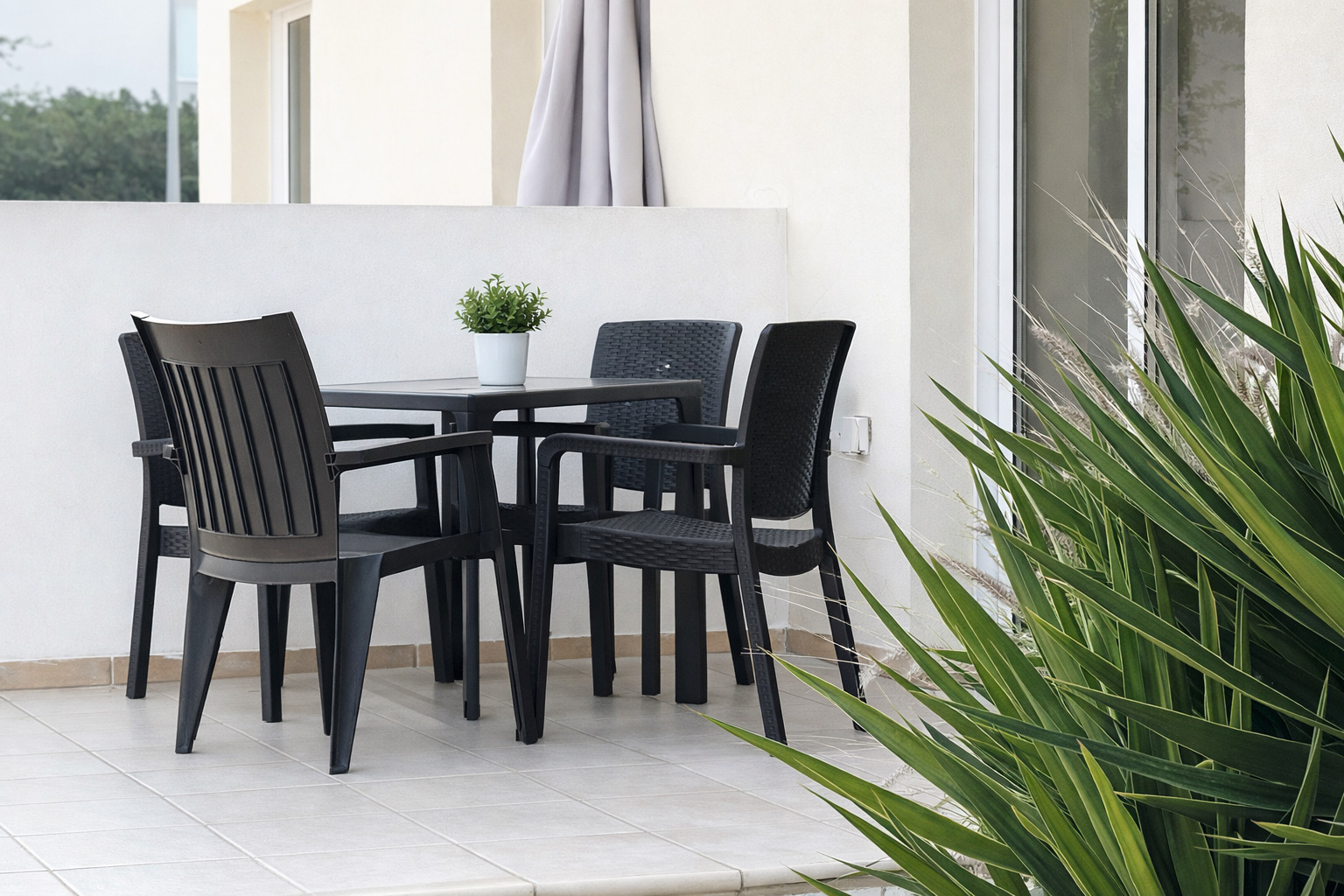 Через раздвижные двери вы попадаете в патио с летней мебелью.