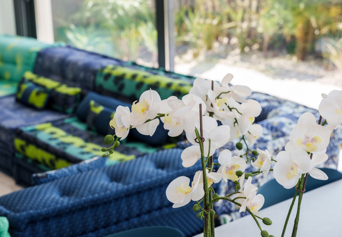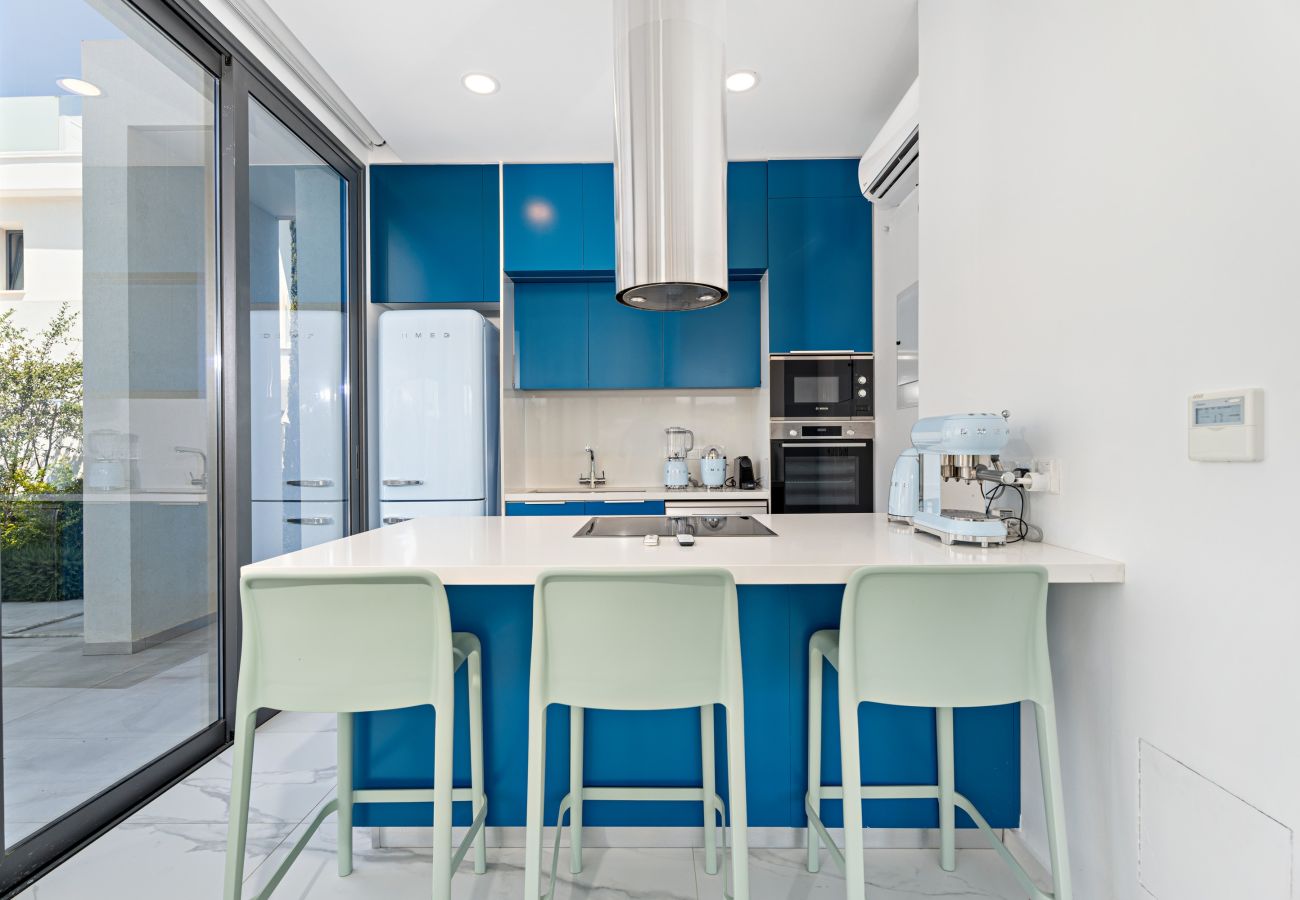 На первом этаже находится просторная гостиная, объединённая со столовой и кухней открытой планировки, а также гостевой туалет. Большие панорамные окна выходят на бассейн, открывая красивый вид из любой точки гостиной и обеспечивая плавный переход между внутренним пространством и зоной у бассейна с садом. Вилла меблирована с особым вниманием к деталям и оснащена всем необходимым для комфортного проживания: удобный диван, широкоформатный телевизор, быстрый Wi-Fi, спутниковое ТВ с английскими, русскими и европейскими каналами, кофемашина Nespresso и полностью оборудованная кухня со всей бытовой техникой.