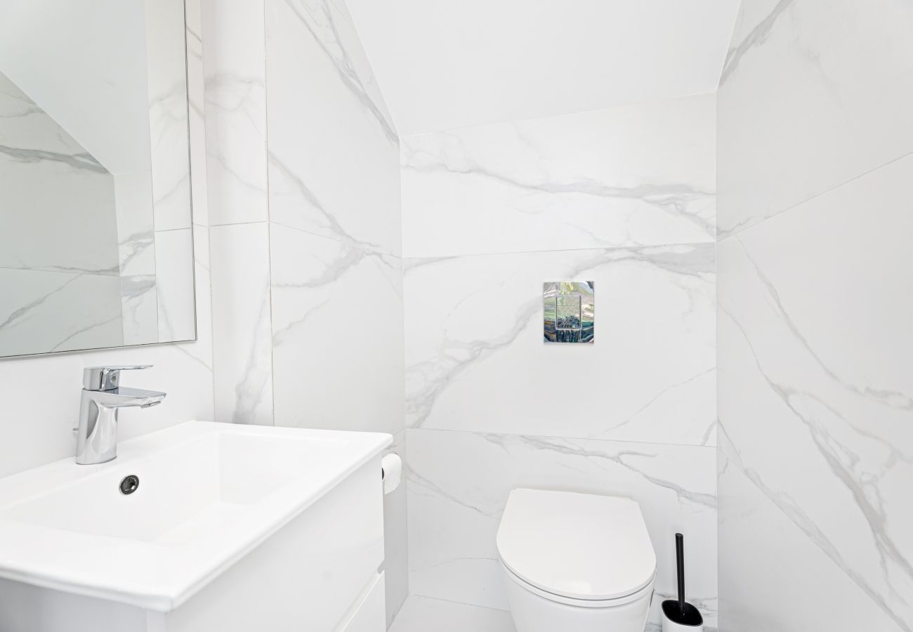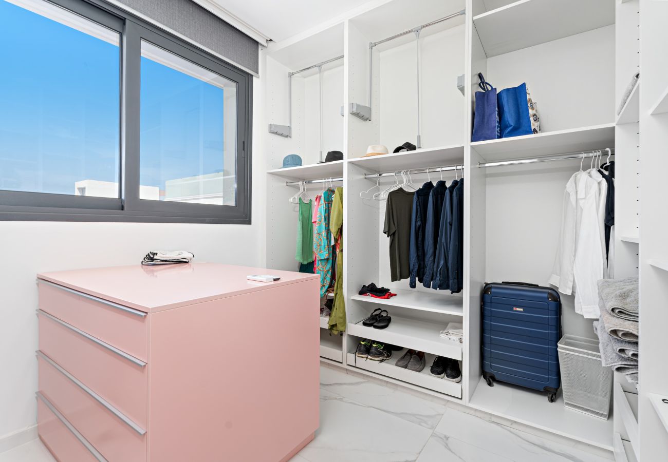 На втором этаже расположены три спальни с собственными ванными комнатами. Главная спальня оснащена душевой, двуспальной кроватью и гардеробной. Вторая и третья спальни также имеют двуспальные кровати и собственные душевые. Стиральная машина находится на площадке верхнего этажа перед выходом на крышу.