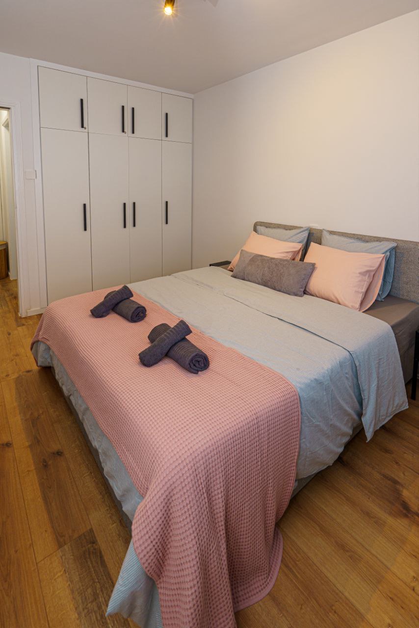 Отдельная спальня оснащена двуспальной кроватью и вместительными шкафами для хранения вещей.