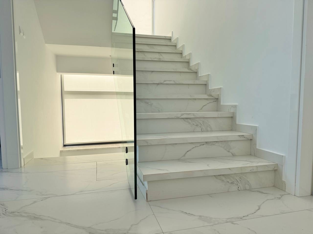 На первом этаже вас ждёт светлое пространство с открытой планировкой, включающее уютную гостиную зону с мягкими диванами и телевизором, обеденную зону и полностью оборудованную кухню с современной техникой, включая кофемашину Nespresso. Также на этом уровне расположен гостевой туалет с умывальником. Большие панорамные окна выходят на террасу у бассейна и создают ощущение единства внутреннего и внешнего пространства.